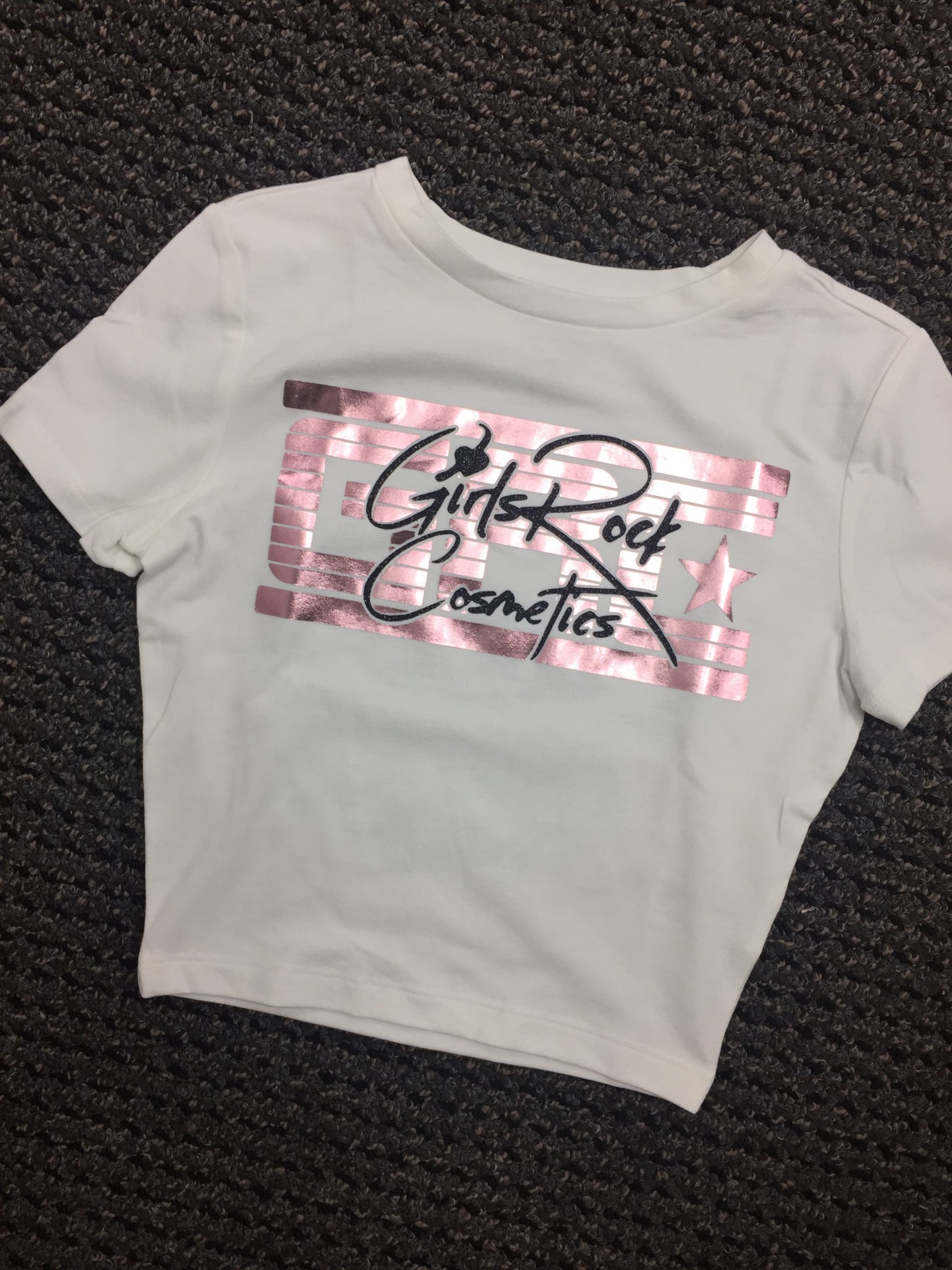 Be the first to review “Crop Tee, White with Rose Gold & Black”